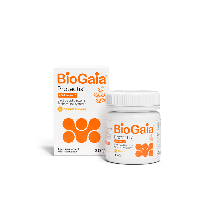 BioGaia® Protectis® D+ is a premium food supplement featuring L. reuteri Protectis®*, one of the world’s most researched probiotics**, and a high dose of Vitamin D. Each tablet contains live, gut-balancing bacteria and Vitamin D formulated to promote a healthy immune system and daily support for overall digestive wellness***.